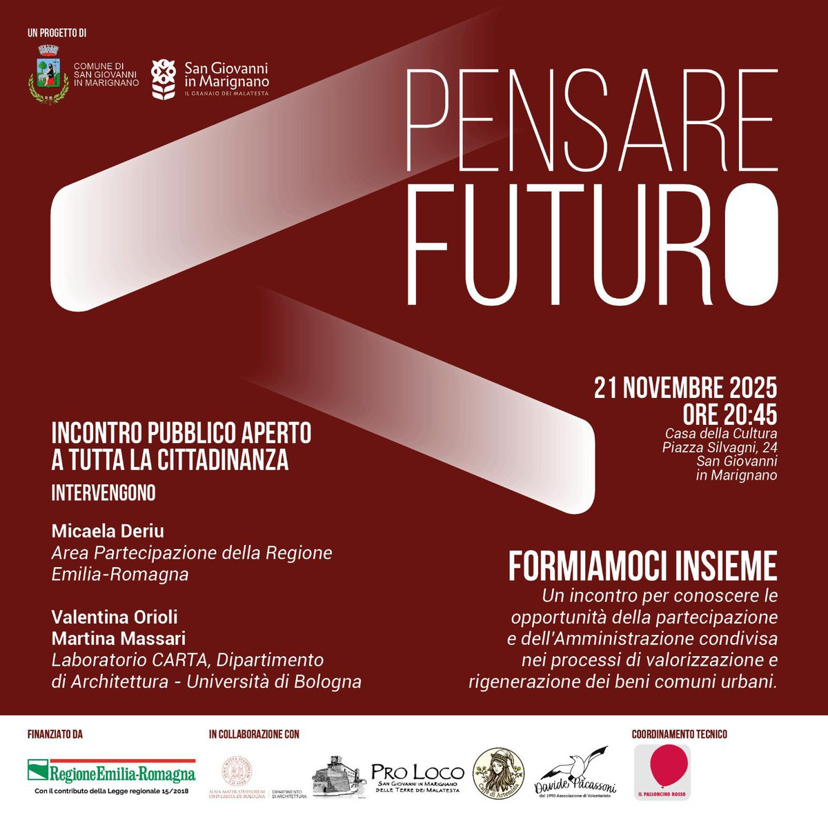 L'evento si svolgerà 𝘃𝗲𝗻𝗲𝗿𝗱𝗶̀ 𝟮𝟭 𝗻𝗼𝘃𝗲𝗺𝗯𝗿𝗲 𝗮𝗹𝗹𝗲 𝗼𝗿𝗲 𝟮𝟬:𝟰𝟱 𝗽𝗿𝗲𝘀𝘀𝗼 𝗹𝗮 𝗖𝗮𝘀𝗮 𝗱𝗲𝗹𝗹𝗮 𝗖𝘂𝗹𝘁𝘂𝗿𝗮 del Comune di San Giovanni in Marignano, per un incontro di confronto e approfondimento sulle opportunità della partecipazione e dell’Amministrazione condivisa nei processi di valorizzazione e rigenerazione dei beni comuni urbani.