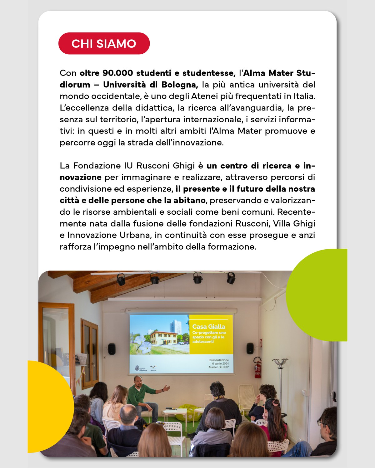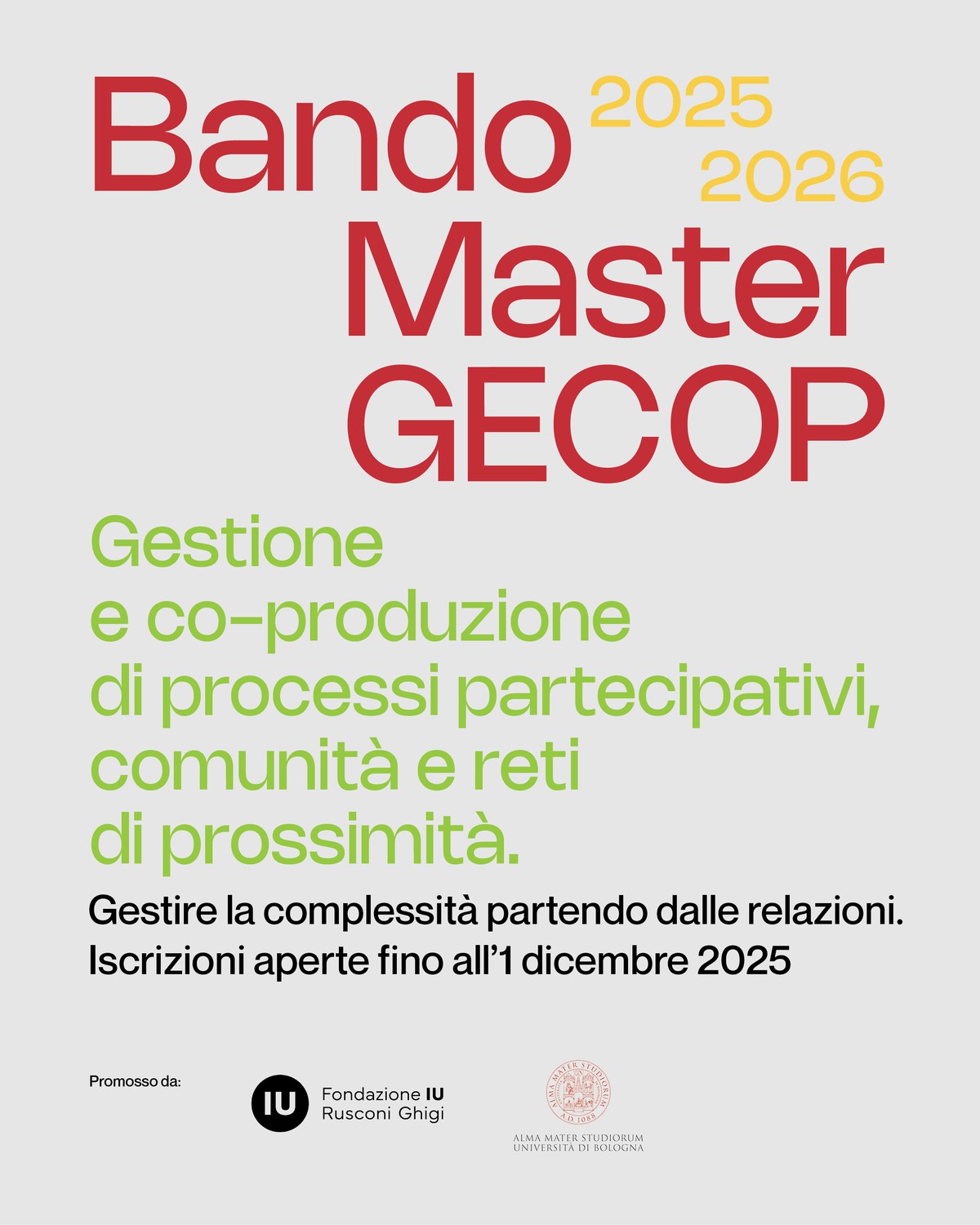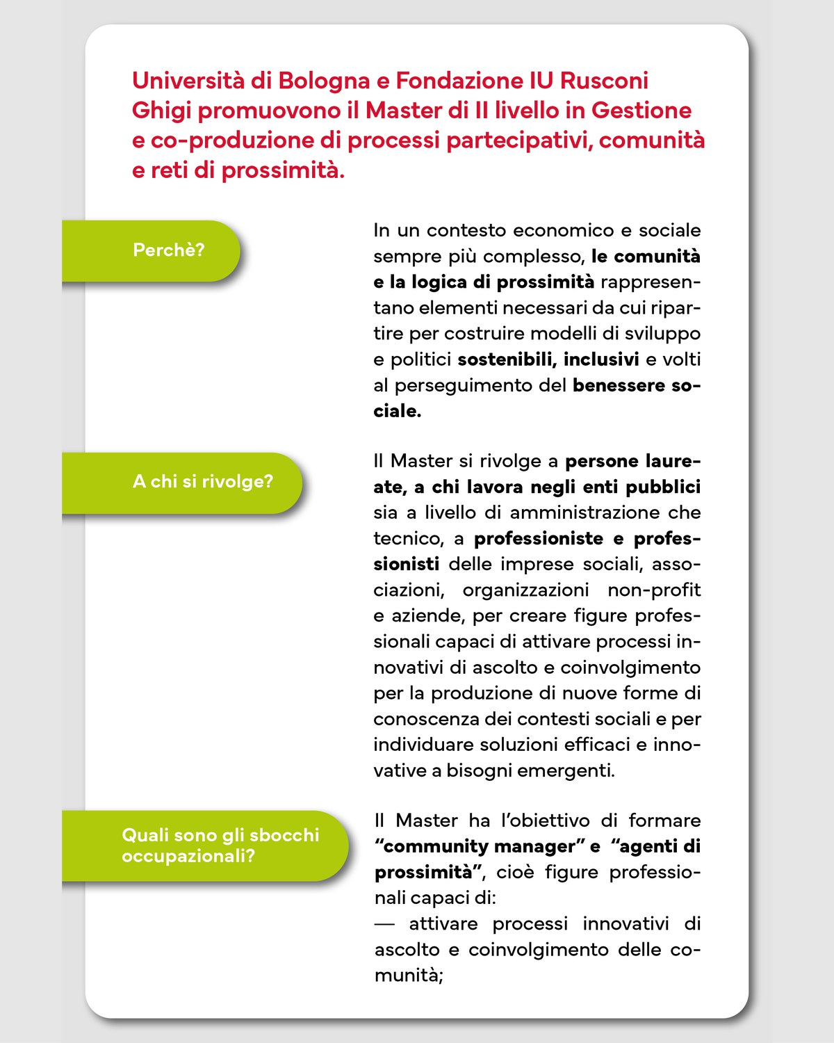 In Gestione e co-produzione di processi partecipativi, comunità e reti di prossimità promosso dalla Fondazione IU Rusconi Ghigi e dall’Università di Bologna. Direttore: Flaviano Celaschi