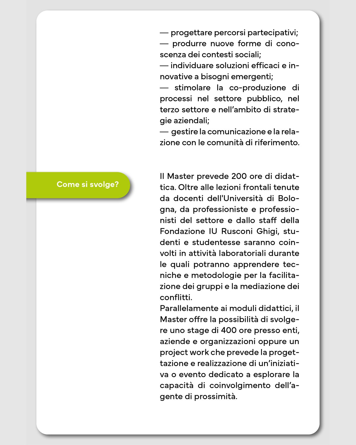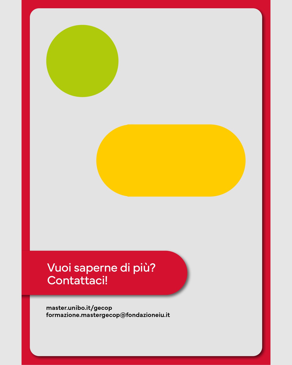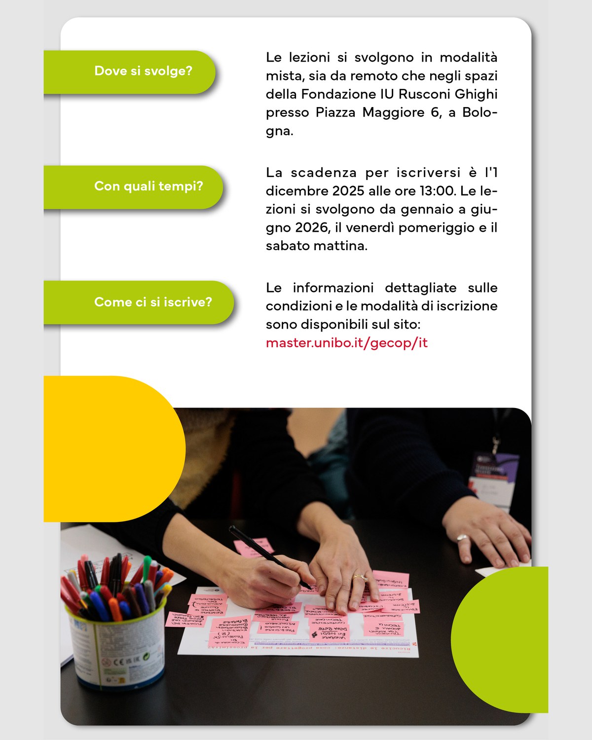 In Gestione e co-produzione di processi partecipativi, comunità e reti di prossimità promosso dalla Fondazione IU Rusconi Ghigi e dall’Università di Bologna. Direttore: Flaviano Celaschi