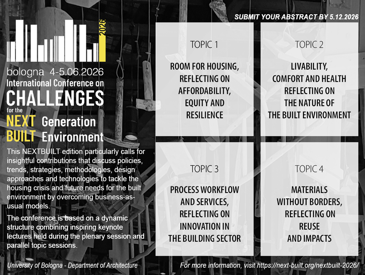 Questa terza edizione di NEXTBUILT mira a stimolare una riflessione sulle sfide dell’abitare di oggi e del prossimo futuro, affrontando in maniera integrata le sfaccettature tecniche e le implicazioni socio-economiche di un parco edilizio inefficiente, il cui rinnovamento richiede la messa in campo di strategie efficaci, accessibili e tempestive, ma anche capaci di considerare l’incertezza e il dinamismo che caratterizza il cambiamento climatico e il quadro sociopolitico globale. La Conferenza si propone di accogliere contributi utili a discutere politiche, tendenze, strategie, metodologie, approcci progettuali e tecnologie per affrontare le esigenze future superando gli schemi oggi abituali. La Conferenza offre l'opportunità di confrontarsi su quattro argomenti chiave, condividendo lezioni apprese, ispirazioni e percorsi per dare forma all'ambiente costruito di prossima generazione.