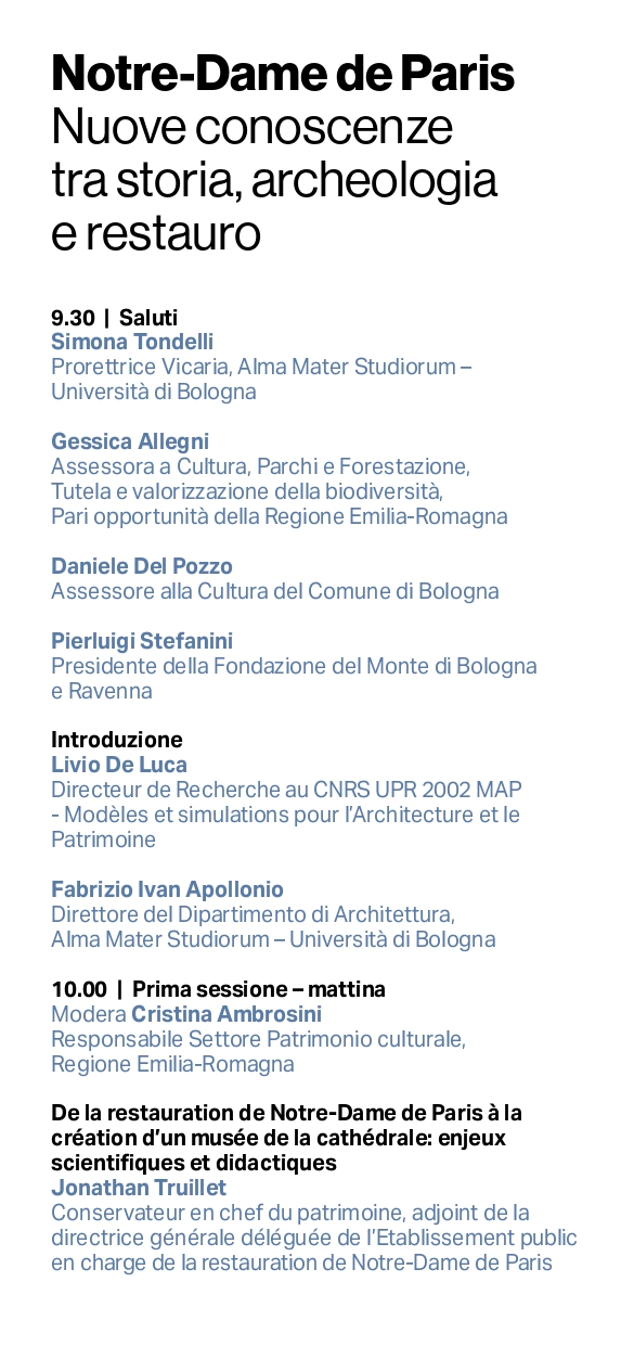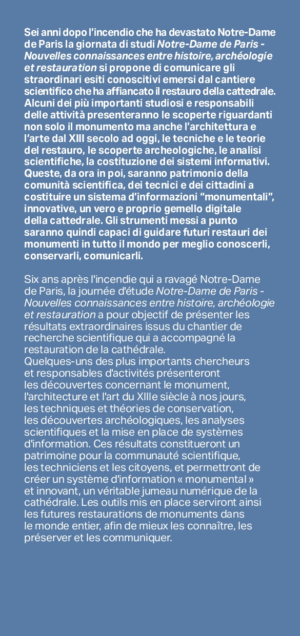 Sei anni dopo l’incendio che ha devastato Notre-Dame de Paris la giornata di studi Notre-Dame de Paris - Nouvelles connaissances entre histoire, archéologie et restauration si propone di comunicare gli straordinari esiti conoscitivi emersi dal cantiere scientifico che ha affiancato il restauro della cattedrale.
